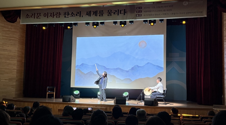 [무한뉴스=정승훈 기자] 세종특별자치시교육청은 12월 23일에 2층 대강당에서 학생과 학부모, 교직원 등 세종 교육공동체를 대상으로 ‘2025년 우리동네 예술학교 예술명사 초청프로그램 소리꾼 이자람: 판소리, 세계를 울리다’를 성황리에 마쳤다.