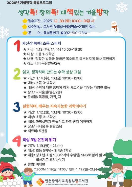 [무한뉴스=정승훈 기자] 인천광역시교육청부평도서관은 겨울방학을 맞아 1월 한달간 새 학년을 준비하는 초등학생과 중학생을 대상으로 겨울방학 특별프로그램을 운영한다.