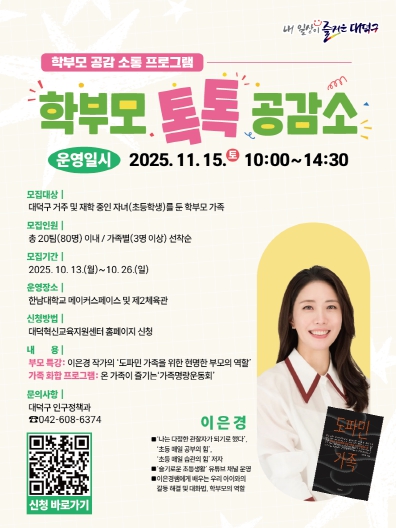 [무한뉴스=정민정 기자] 대전 대덕구는 오는 11월 15일 한남대학교 메이커스페이스 및 제2체육관에서 학부모와 자녀가 함께 참여하는 공감 소통 프로그램 ‘학부모 톡톡 공감소’를 운영한다고 밝혔다.