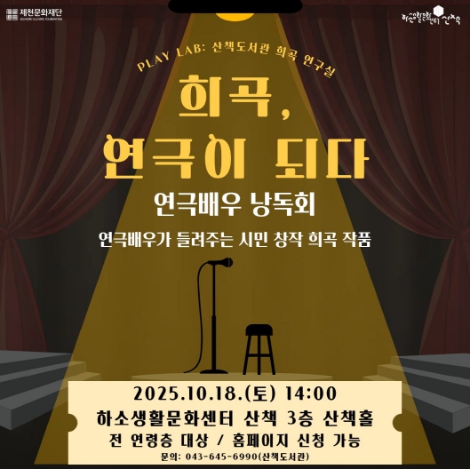[무한뉴스=정민정 기자] 제천문화재단(이사장 김상수)이'2025년 문학상주작가 지원사업'의 일환으로 상주작가와 마지막 문학프로그램인 '희곡, 연극이 되다' 연극배우 낭독회를 오는 18일 하소생활문화센터 산책에서 선보인다.
