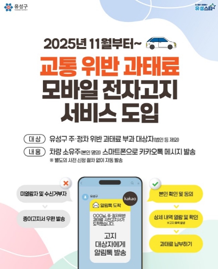 [무한뉴스=정민정 기자] 대전 유성구는 교통위반 과태료 고지서를 스마트폰으로 받아볼 수 있는 ‘모바일 전자고지 서비스’를 11월부터 본격 시행한다고 30일 밝혔다.