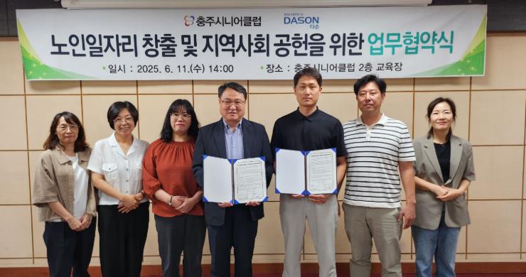 [무한뉴스=정민정 기자] 충주시니어클럽과 ㈜다손은 충주시니어클럽 교육장에서 노인일자리 창출과 지역사회 공헌을 위한 업무협약을 체결했다고 12일 밝혔다.