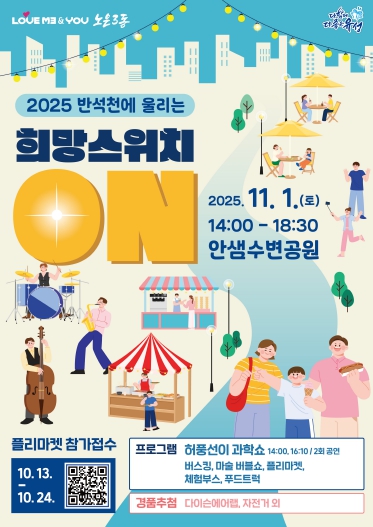 [무한뉴스=정민정 기자] 대전 유성구는 11월 1일 지족동 안샘수변공원에서 ‘2025 노은3동 반석천에 울리는 희망스위치 ON’ 행사를 개최한다.