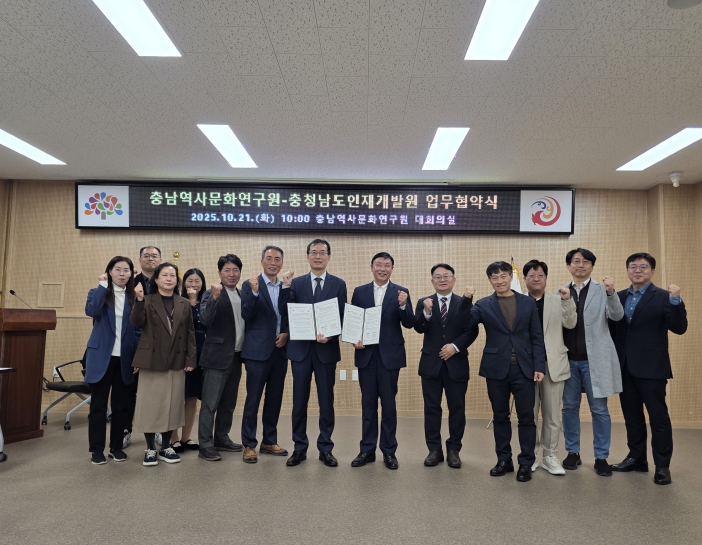 [무한뉴스=정민정 기자] 충남인재개발원과 충남역사문화연구원은 21일 연구원 대회의실에서 지역 인재 양성 및 역사·문화 가치 확산을 위한 업무협약을 체결했다.