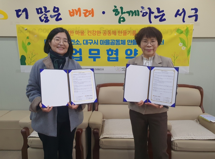 서구보건소는 효과적이고 실질적인 건강리더 양성교육 을 위해 4월 18일 대구시 마을공동체만들기지원센터와 업무협약을 체결했으며, 양 기관의 협력을 통해 건강리더의 역할과 역량 강화를 위한 교육을 공동으로 추진하고 있다.