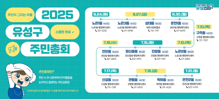 이번 총회는 24일 노은1동을 시작으로 차례대로 열리며 자세한 일정과 참여 방법은 각 동 행정복지센터 또는 유성구청 홈페이지에서 확인하면 된다.