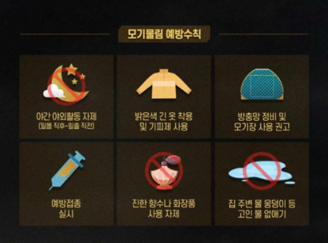 경남도 관계자는 “모기가 활동하는 4월~10월까지 야간 야외 활동 자제해 모기 물림을 예방하도록 하고 야간 외출 시에는 밝은색 긴 옷과 품이 넓은 옷 착용하고 모기 기피제를 사용하는 등 개인 예방 수칙을 준수할 것”을 당부했다.