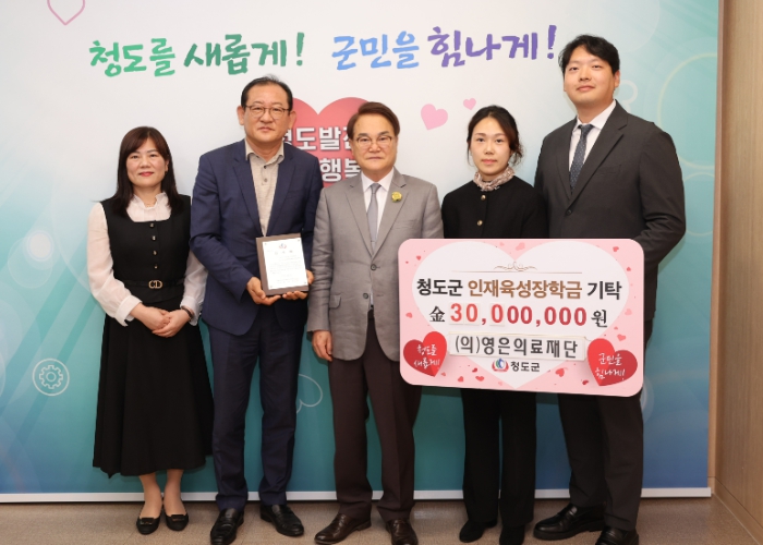 [무한뉴스=최진수 기자] 의료법인 영은의료재단 허계영 이사장은 지난 4월 22일 청도군의 우수한 인재 발굴과 교육 환경 개선을 위해 (재)청도군인재육성장학회에 장학금 3천만 원을 기탁했다.