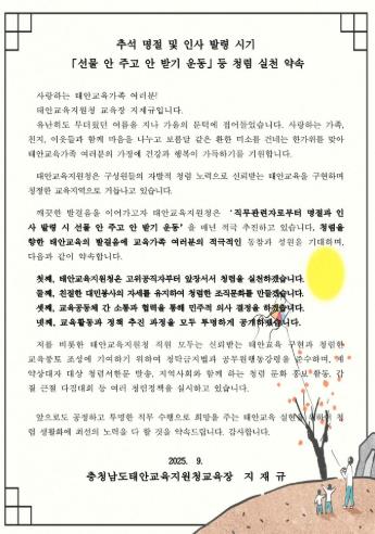[무한뉴스=정민정 기자] 충청남도태안교육지원청은 추석 연휴 시기를 맞아 청렴한 공직문화를 확산하기 위해 ‘선물 안 주고 안 받기 운동’을 강조하는 청렴 서한문을 홈페이지에 게시했다.