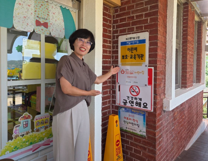| ▲ 곽영주 제일어린이집 원장이 365x24 어린이집 현판 앞에서 기념사진을 찍고 있다. |