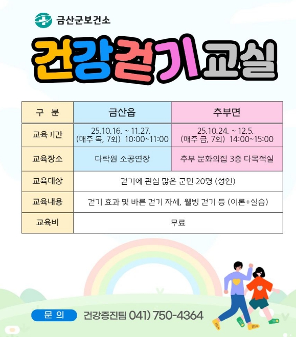 [무한뉴스=정민정 기자] 금산군보건소는 군민의 건강증진과 생활 속 신체활동 실천을 위해 오는 12월까지 금산읍·추부면에서 건강 걷기 교실을 운영한다.