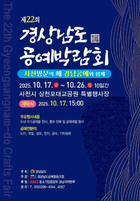 [무한뉴스=최진수 기자] 경상남도는 10월 17일부터 26일까지 10일간 사천시 삼천포대교공원 특별행사장에서 ‘제22회 경남 공예박람회’를 개최한다고 밝혔다.