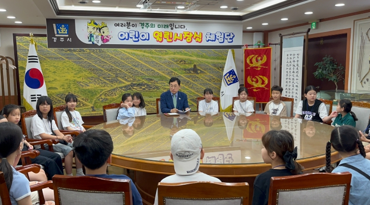 | ▲ ‘어린이 열린시장실 체험단’에 참여한 초등학생들이 경주시청 시장실에서 시정 운영과 APEC 개최 과정 등에 대해 설명을 듣고 있다. |