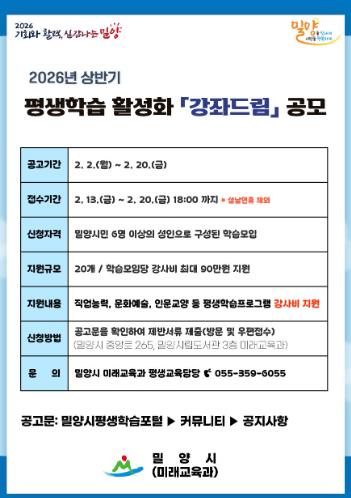 [무한뉴스=최진수 기자] 경남 밀양시는 시민이 원하는 시간과 장소에 맞춤형 평생학습 프로그램을 제공하는 2026년 상반기 평생학습 활성화 사업 ‘강좌드림’의 공모를 추진하고, 오는 13일부터 신청을 받는다고 밝혔다.