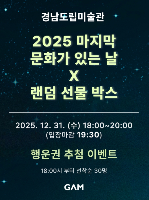[무한뉴스=최진수 기자] 경남도립미술관은 12월 31일 ‘문화가 있는 날’을 맞이해 연말을 함께 즐길 수 있는 특별 이벤트를 마련한다고 밝혔다.