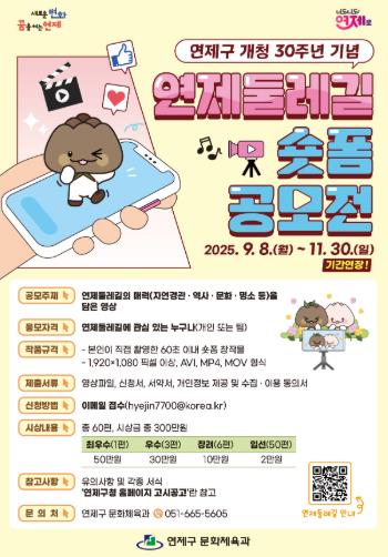[무한뉴스=최진수 기자] 연제구는 연제둘레길의 매력을 널리 알리기 위해 진행 중인 ‘연제둘레길 숏폼 공모전’의 접수기간을 11월 30일까지 연장한다.