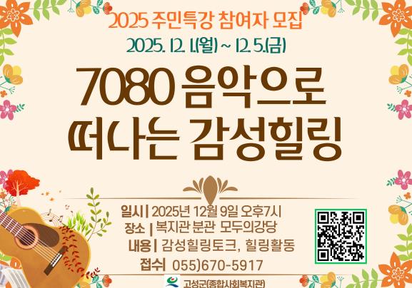 [무한뉴스=최진수 기자] 고성군에서 운영 중인 고성군종합사회복지관에서는 2025년 12월 9일 19시 종합사회복지관 분관 모두의 강당에서 고성군민을 대상으로 7080 음악으로 떠나는 감성 힐링이라는 주제로 특강을 진행한다.