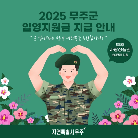 입영지원금 지급 대상은 입영일 기준 1년 이상 무주군에 주민등록을 두고 거주하는 청년 중 입영통지서(발급일 2025년 6월 1일 이후)를 받은 현역병과 사회복무요원이다. 이들에게는 1인당 무주사랑상품권 20만 원(1회 한)이 지급된다.