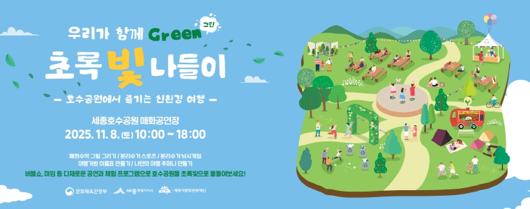 [무한뉴스=정민정 기자] 세종시문화관광재단은 11월 8일 10시부터 18시까지 세종호수공원 매화공연장에서 2025 비단가람 탄소중립 체험행사 ‘우리가 함께 그린(Green) 초록빛 나들이’를 개최한다.