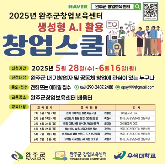 모집 기간은 6월 16일까지이며, 완주군 창업보육센터에 전화 또는 이메일을 통해 신청이 가능하다.