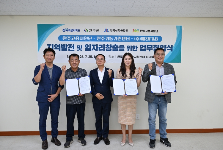 이날 협약식에서는 완주고용지원단, 완주군귀농귀촌지원센터, ㈜예천F&B 등 3개 기관과 기업이 협약을 체결하고, 귀농귀촌인의 일자리 연계와 농산물 계약재배 확대, 지역 산업 활성화를 위해 상호 협력해 나가기로 했다.