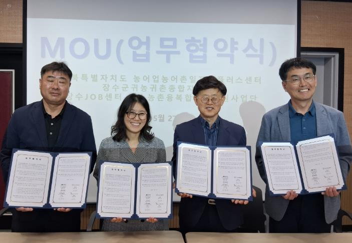 [무한뉴스=정민정 기자] 장수군귀농귀촌종합지원센터는 27일 전북특별자치도농어업 · 농어촌일자리플러스센터를 비롯해 장수로컬job센터, 장수농촌융복합산업지원사업단과 함께 상호 협력적 연계를 통해 농어촌 활력 제고를 목표로 일자리 업무협약(MOU)을 체결했다.