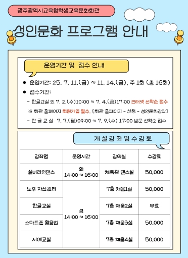 [무한뉴스=정민정 기자] 광주광역시교육청학생교육문화회관은 지역 주민을 대상으로 ‘2025 성인문화프로그램’ 수강생을 선착순 모집한다.