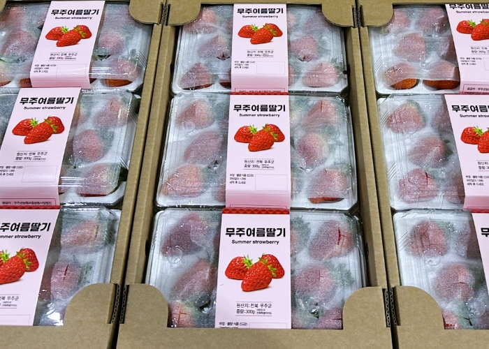 무주군농업기술센터에 따르면 지역 내 여름딸기 재배 농가 20곳에서는 고랭지 기후적 장점을 활용해 '고슬', '무하', '미하', '복하' 등의 품종을 재배하고 있으며 지난 5월 말부터 매일 딸기를 출하(1일 1톤가량)하고 있다. 딸기는 농협안성농식품물류센터, 홈플러스, CJ, 대형카페 등지로 납품되고 있다.