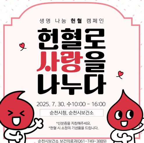 [무한뉴스=정민정 기자] 순천시는 하절기 생명나눔 문화 확산을 위해 오는 30일 오전 10시부터 오후 4시까지 순천시청과 순천시보건소 앞에서 사랑의 헌혈 행사를 진행한다고 밝혔다.
