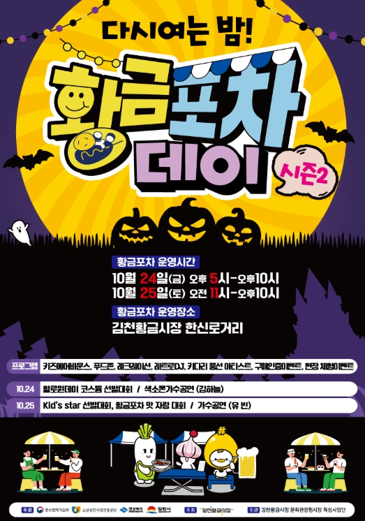 ‘황금포차 데이’는 지난 6월 성황리에 마친 시즌1에 이어 열리는 행사로, 황금시장 한신로 일원에서 26개 먹거리 부스와 공연, 어린이 체험행사 등이 다채롭게 꾸며진다.