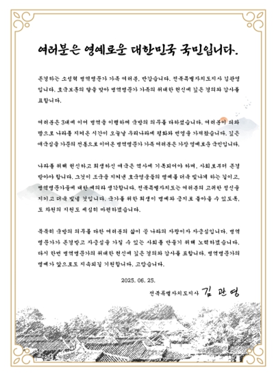 김관영 전북자치도지사는 서한에서 “3대에 걸친 병역 이행은 나라를 향한 책임과 신념이 대를 이어 실천된 결과”라며 “병역명문가의 헌신은 모든 도민이 본받아야 할 소중한 가치이자 우리 사회가 지켜야 할 자긍심”이라고 밝혔다. 이어 “병역명문가에 대한 예우와 지원을 꾸준히 확대해 나가겠다”고 전했다.