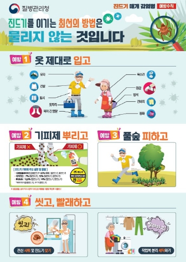 진드기 매개 감염병을 예방하기 위해서는 ▲피부 노출 최소화해 안전하게 옷 갖춰 입기(밝은색 긴 옷, 모자, 목수건, 목 긴 양말, 장갑, 장화 등) ▲방석, 돗자리, 기피제 등 보조도구 사용하여 진드기 접촉 피하기 ▲귀가 즉시 착용 복장 일체 세탁 및 샤워 ▲증상 발생 시 의료기관 방문해 진료받기 등이다.
