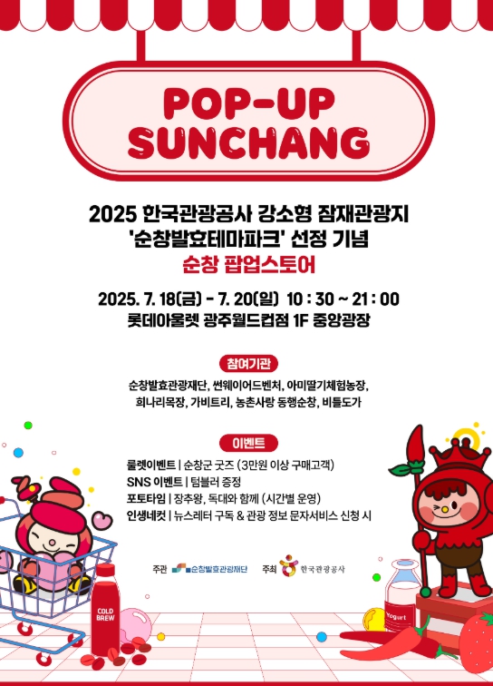 이와함께, 현장에서는 3만 원 이상 구매 고객을 대상으로 한 룰렛 이벤트를 통해 순창 굿즈를 증정하며, 인생네컷 촬영, 캐릭터 포토타임, 포토존, SNS 인증 이벤트 등 MZ세대를 겨냥한 체험형 콘텐츠도 다채롭게 운영될 예정이다.