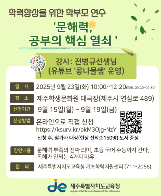 [무한뉴스=정민정 기자] 제주특별자치도교육청은 23일 학생문화원 대극장에서 초등학교 보호자 150명을 대상으로 학력 향상 지원을 위한 문해력 영역 연수를 운영한다.
