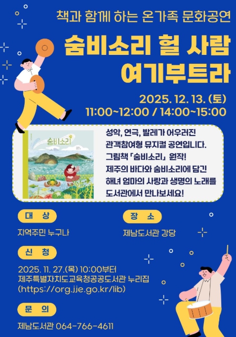 [무한뉴스=정민정 기자] 제주도교육청 제남도서관은 12월 13일 오전 11시와 오후 2시 두 차례 유아·초등학생과 보호자, 지역주민 200명을 대상으로 책과 함께 하는 온가족 문화공연 ‘숨비소리 헐 사람 여기부트라’를 운영한다.