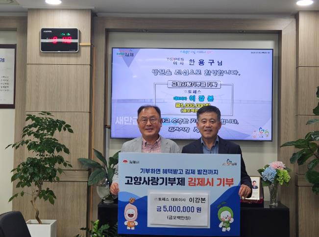 [무한뉴스=정민정 기자] 김제시는 ㈜토페스 이강본 대표가 3일 고향사랑기부금 500만 원을 기탁했다고 밝혔다.
