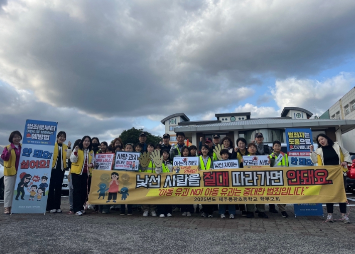[무한뉴스=정민정 기자] 제주도교육청 동광초등학교는 27일 등굣길에 학부모회와 전교어린이회, 교직원, 동부경찰서가 함께 참여한 어린이 유괴예방 캠페인을 실시했다.