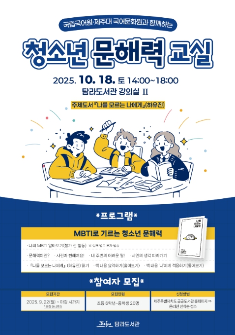 [무한뉴스=정민정 기자] 제주시 탐라도서관은 제주대학교 국어문화원 지원사업의 일환으로 ‘청소년 문해력 교실’을 운영한다.