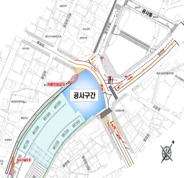 공사 기간 용담사거리에서 제주서초교 방면 도로는 기존 4차선에서 2차선으로, 용한로에서 용담사거리 방면 좌회전 차로도 2차선에서 1차선으로 축소된다.