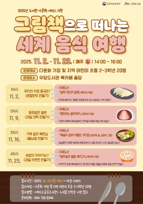 [무한뉴스=정민정 기자] 제주시 우당도서관은 2025년 도서관 다문화 서비스 지원 사업인 ‘그림책으로 떠나는 세계 음식 여행’ 프로그램 참여자를 10월 23일부터 선착순 모집한다.