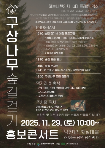 [무한뉴스=정민정 기자] 인제군마케팅센터는 오는 11월 29일 남면 남전리 일원에서 ‘구상나무 숲길 걷기 홍보 콘서트’를 개최한다. 이번 행사는 남전리 지역에 새롭게 개방된 약 6,500그루 규모의 구상나무 숲길을 주민과 관광객에게 소개하고, 구상나무 보전 가치를 널리 알리기 위해 마련됐다.
