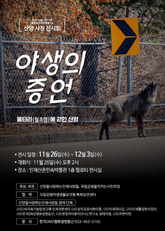 [무한뉴스=정민정 기자] ‘산양을 사랑하는 인제 사람들’과 ‘국립공원을지키는시민의모임’은 오는 11월 26일부터 12월 3일까지 인제산촌민속박물관 1층 필로티 전시실에서 ‘야생의 증언 – 울타리(철조망)에 갇힌 산양(천연기념물 제217호, 멸종위기 야생생물 1급)’ 사진전을 개최한다.