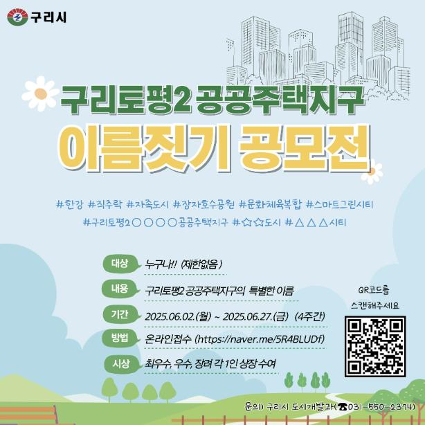 6월 2일부터 구리시 홈페이지 좌측 상단 배너 또는 QR코드를 통해 온라인으로 신청 접수할 수 있으며, ▲구리토평2 공공주택지구의 개발 방향에 적합한지 ▲다양한 상황에 유연하게 활용할 수 있는지 ▲얼마나 새롭고 창의로운지▲기억하기 쉽고 부르기 쉬운 친근한 명칭인지 등의 기준을 통한 1, 2차 심사를 거쳐, 최종 당선작에는 최우수, 우수, 장려상이 수여된다.