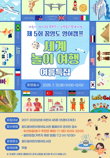 [무한뉴스=정승훈 기자] 인천 동구는 꿈드림어린이영어도서관(이하 꿈영도)에서 오는 7월 1일~8일까지 ‘제5회 꿈영도 영어캠프’ 참가자를 선착순으로 모집한다고 밝혔다. 모집 인원은 총 45명이다.