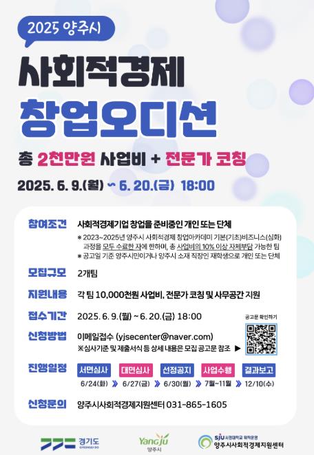 [무한뉴스=정승훈 기자] 양주시가 오는 20일까지 사회적경제 분야의 창의적이고 혁신적인 창업 아이디어를 발굴하기 위해 기획한 ‘2025 양주시 사회적경제 창업오디션’의 참가자를 공개 모집한다고 밝혔다.