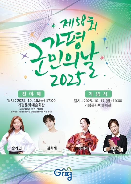 [무한뉴스=정승훈 기자] 가평군은 오는 16일 오후 5시, 새롭게 리모델링을 마친 가평문화예술회관에서 ‘제58회 가평군민의 날 전야제’를 개최한다. 이번 행사는 ‘다시, 가평으로’를 슬로건으로 내세워 수해 극복과 지역 재도약을 기원하며 군민 화합의 의미를 담아 열린다.