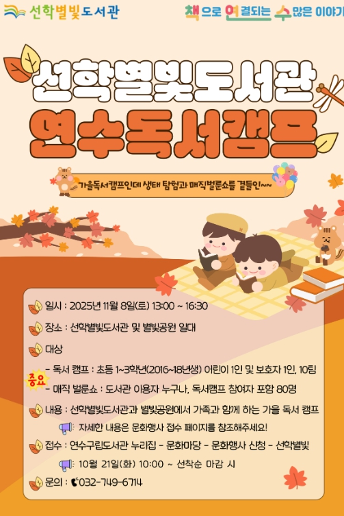 [무한뉴스=정승훈 기자] 연수구 선학별빛도서관은 오는 11월 8일 선학별빛도서관 및 별빛공원 일대에서 지역 주민을 대상으로 ‘연수독서캠프’를 개최한다.