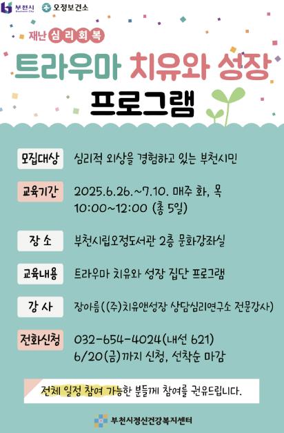 프로그램은 6월 26일부터 7월 10일까지 매주 화요일과 목요일 오전 10시부터 12시까지 부천시립오정도서관 교육실에서 운영된다. 심리적 외상을 겪고 있는 부천시민이면 누구나 참여할 수 있으며, 신청은 6월 20일까지 선착순으로 마감된다.