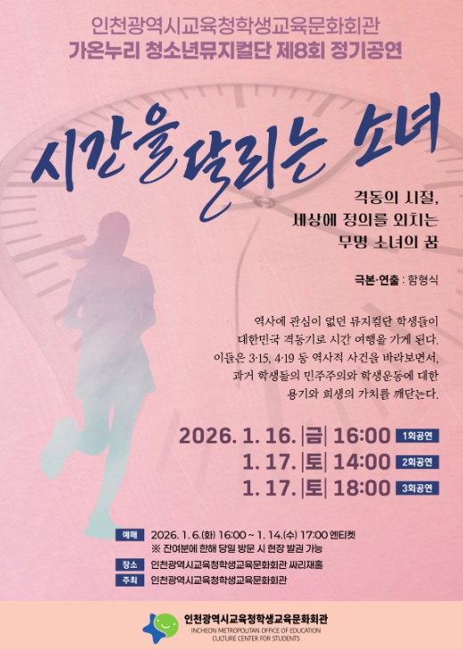 [무한뉴스=정승훈 기자] 인천광역시교육청학생교육문화회관은 가온누리 청소년뮤지컬단 제8회 정기공연 ‘시간을 달리는 소녀’를 16일부터 17일까지 싸리재홀 대공연장에서 개최한다.