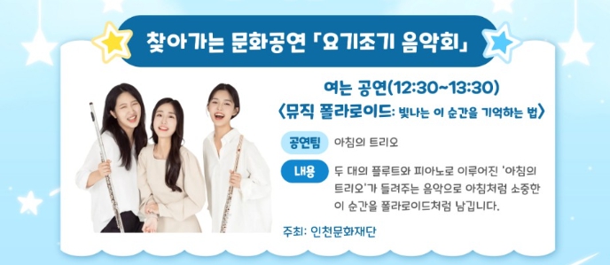 공연에는 ‘아침의 트리오’가 참여해 두 대의 플루트와 한 대의 피아노로 구성된 편안하고 싱그러운 음악을 선보일 예정이다.